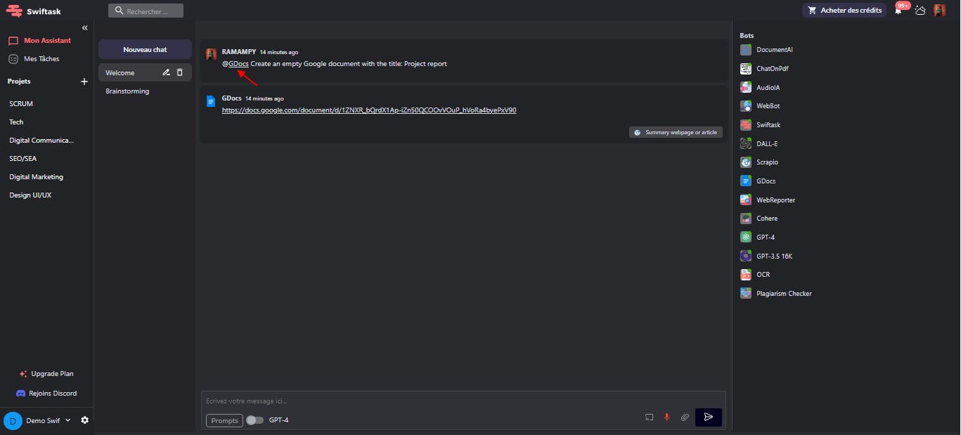 Swiftask offers a range of intelligent and creative bots to assist you in your daily tasks. Whether you need help with text writing, image generation, data processing, audio transcription, or customer conversations, you will find the bot that suits you. Swiftask, GPT-4, AudioIA, DALL-E, DataChat, DocumentAI: we let you make your choice.