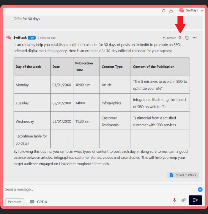 You can now request the AI on Swiftask to generate a new response using the initial query. This feature is only available for the latest AI response selected to assist you. Response regeneration allows you to gain a new perspective or a more tailored response to your needs. This enables you to further explore the various possibilities of the AI response and obtain more precise information when necessary.