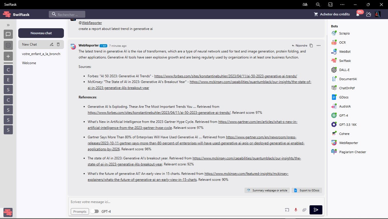 To top it all off, you can harness your research results with GPT or other Swiftask bots within the same chat. Explore Web Reporter on Swiftask and simplify your research process now!