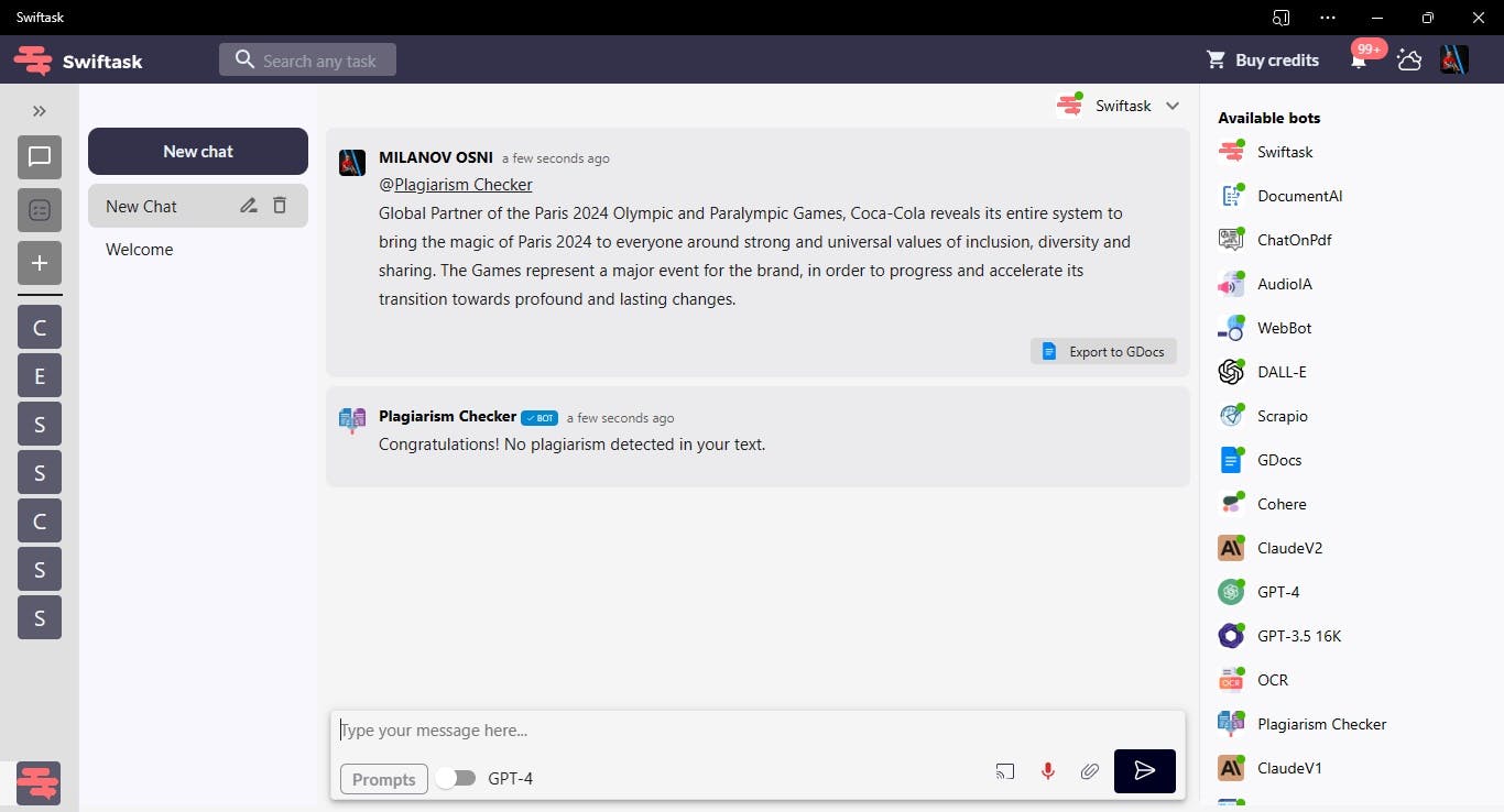 If the plagiarism rate is high in your document, you can submit a task to your favorite bot on Swiftask for it to rewrite the text and eliminate plagiarism.