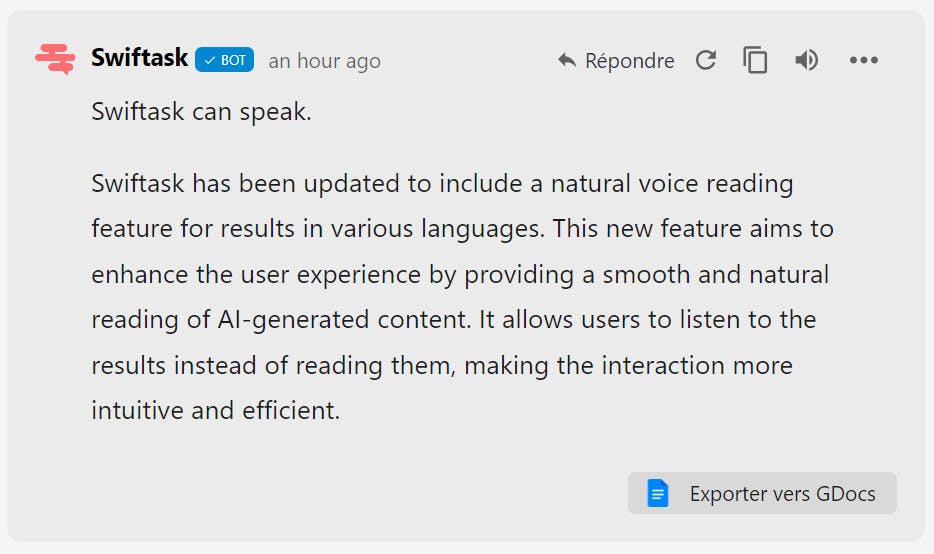 Swiftask has been updated to include a natural voice reading feature for results in various languages. This new feature aims to enhance the user experience by providing a smooth and natural reading of AI-generated content. It allows users to listen to the results instead of reading them, making the interaction more intuitive and efficient.