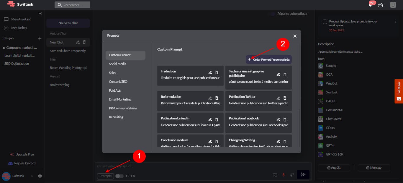 The Swiftask platform now offers the possibility to design a customized AI assistant, tailored to your specific projects and needs. Optimize your productivity and achieve optimized results through the integration of a bot that understands the subtleties of your field. This bot will be able to generate content according to precise directives and will be available at all times. All members of the same Swiftask workspace will have access to this bot and can in turn boost their performance.