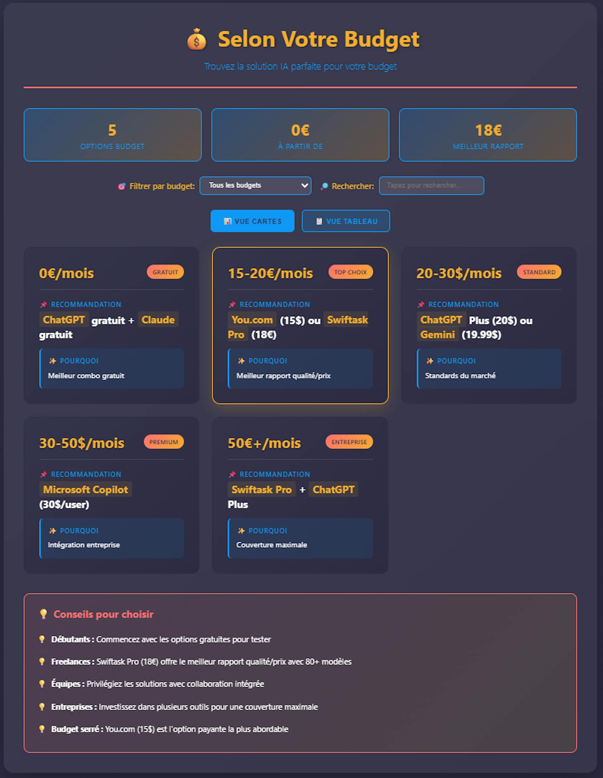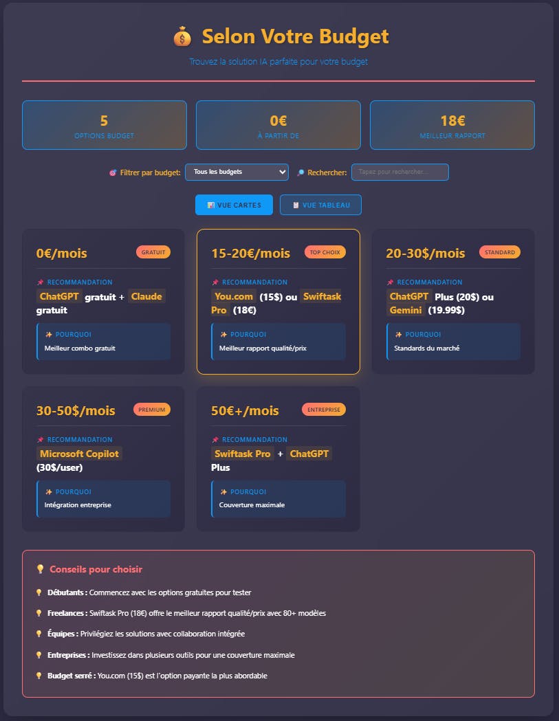 Budget limité (<20$/mois) → You.com (15$/mois) ou Swiftask (18€/mois)
